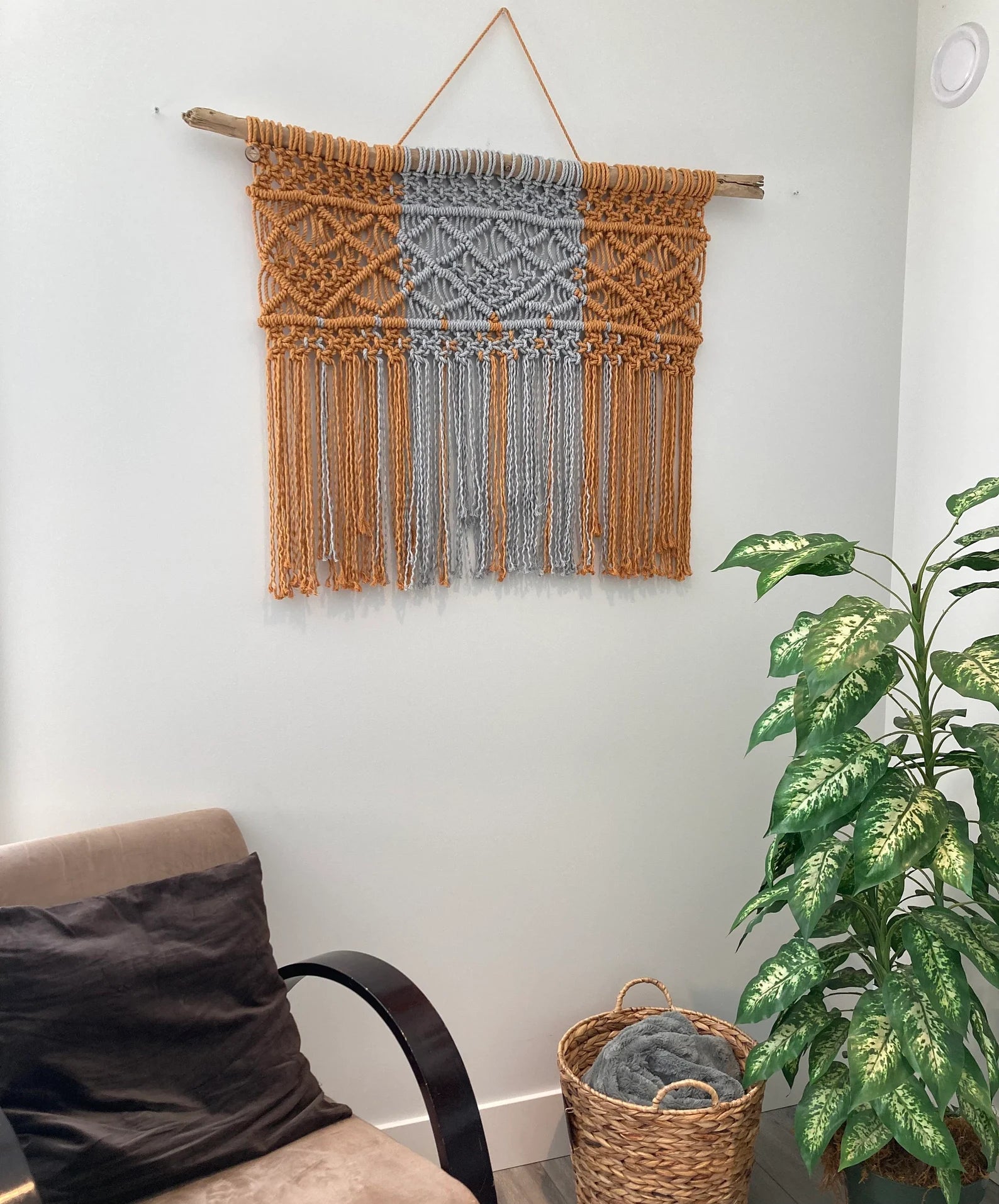 This large piece makes a statement in any home. Perfect for living room or bedroom, this boho Westcoast art will add warmth and depth to your home. Made on hand forged driftwood collected from the beaches of Vancouver Island and with 100% recycled cotton cord.